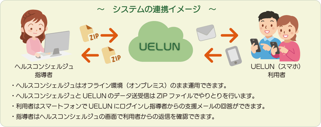 ヘルスケアチャットツール UELUN(ウエルン)の公式ページを公開しました。UELUN(ウエルン)は、特定保健指導をサポートするためのチャットツールです。オンプレミスの特定保健指導管理システム ヘルスコンシェルジュとクラウドのUELUNをシームレスに連携し、利用者の継続的支援をバックアップします。